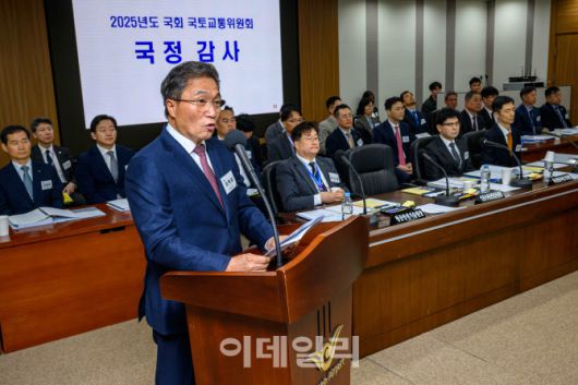 [공항사진기자단] 이학재 인천국제공항공사 사장이 27일 인천 중구 인천국제공항공사에서 열린 국회 국토교통위원회의 인천국제공항공사, 한국공항공사, 항공안전기술원, 국립항공박물관에 대한 국정감사에 출석해 업무보고를 하고 있다.