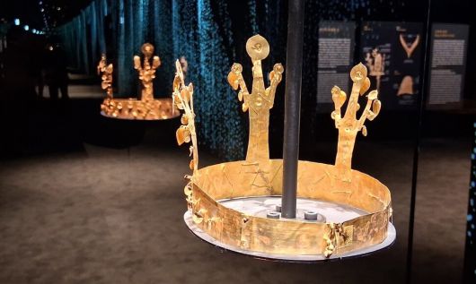 전시는 1969년 도굴됐다가 1972년 되찾은 교동 금관으로 시작한다. 나뭇가지 세움 장식 3개만 관대에 붙어 있는 단촐한 모양새를 띠지만, 1세기 만에 황남대총 북분 금관을 통해 나뭇가지 모양 세움 장식과 화려한 달개를 단 전형적 양식으로 발전한다. 이런 전통적 전형성이 황남대총 북분, 남분의 금제 허리띠로 이어진다는 것을 가로축 전시 동선을 통해 차분하게 일러준다.