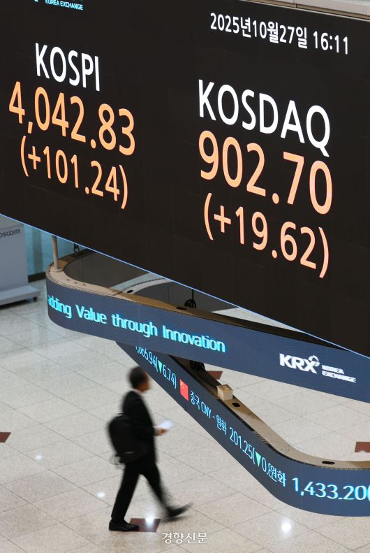 코스피 종가가 사상 처음 4000선을 넘은 27일 서울 영등포구 한국거래소 전광판에 코스피,코스닥 지수가 표시되고 있다. 한수빈 기자 |