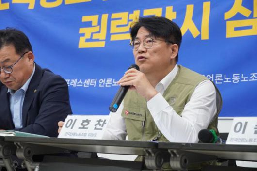 이호찬 전국언론노동조합 위원장이 27일 서울 중구 언론노조 대회의실에서 열린 '정보통신망법 개정에 대한 언론4단체 기자간담회'에서 발언하고 있다. 전국언론노동조합 제공 |