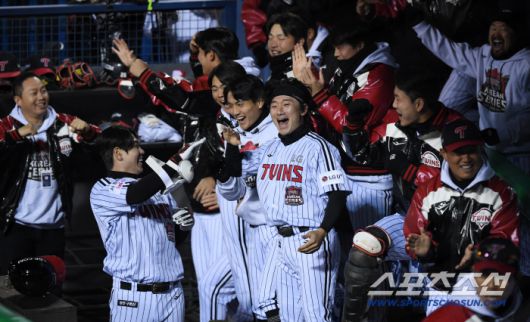 27일 잠실구장에서 열린 한국시리즈 1차전 LG 트윈스와 한화 이글스의 경기. 2회말 무사 만루 LG 박동원 적시타 때 득점한 주자들이 환호하고 있다. 잠실=박재만 기자 pjm@sportschosun.com/2025.10.27/