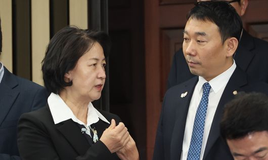 더불어민주당 소속 국회 법제사법위원장인 추미애 의원과 간사인 김용민 의원이 지난 26일 서울 여의도 국회에서 의원총회에서 대화하고 있다. 연합뉴스 |