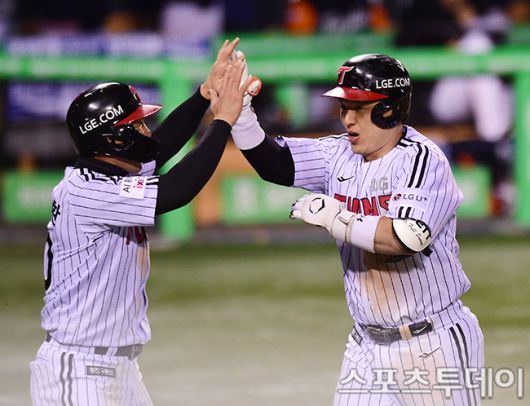 [스포츠투데이 권광일 기자] 2025 신한은행 SOL Bank KBO리그 한국시리즈 2차전 한화 이글스와 LG 트윈스의 경기가 27일 서울 잠실야구장에서 열렸다. LG 박동원이 3회말 1사1루에서 투런홈런을 치고 있다. 2025.10.27. [스포츠투데이 권광일 기자 sports@stoo.com]