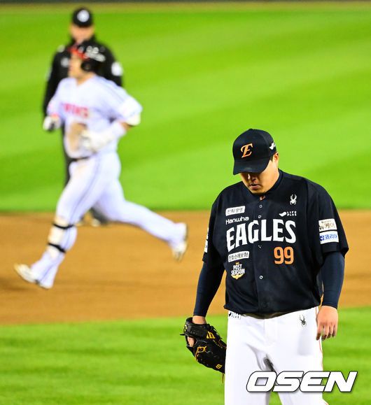 [OSEN=잠실, 지형준 기자] 27일 오후 서울 잠실야구장에서 2025 신한 SOL Bank KBO리그 포스트시즌 한국시리즈 2차전 LG 트윈스와 한화 이글스의 경기가 열렸다. LG는 임찬규, 한화는 류현진을 선발 투수로 내세웠다. 3회말 2사 2루에서 한화 류현진이 LG 박동원에 좌월 투런포를 허용하며 아쉬워하고 있다. 2025.10.27 /jpnews@osen.co.kr