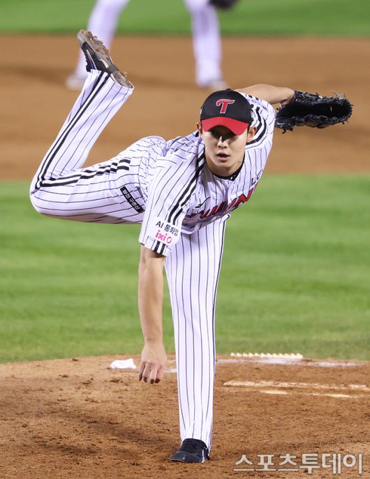[스포츠투데이 팽현준 기자] 27일 서울 잠실야구장에서 열린 2025 KBO리그 LG 트윈스와 한화 이글스의 한국시리즈 2차전, 4회초 2사 만루 LG 김영우가 역투하고 있다. 2025.10.27. [스포츠투데이 팽현준 기자 sports@stoo.com]