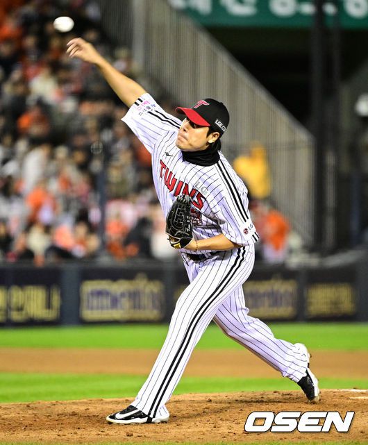 [OSEN=잠실, 이대선 기자] 27일 오후 서울 잠실야구장에서 2025 신한 SOL Bank KBO리그 포스트시즌 한국시리즈 2차전 LG 트윈스와 한화 이글스의 경기가 열렸다. LG는 임찬규, 한화는 류현진을 선발 투수로 내세웠다. 4회초 2사 만루에서 LG 김진성이 역투하고 있다. 2025.10.27 /sunday@osen.co.kr