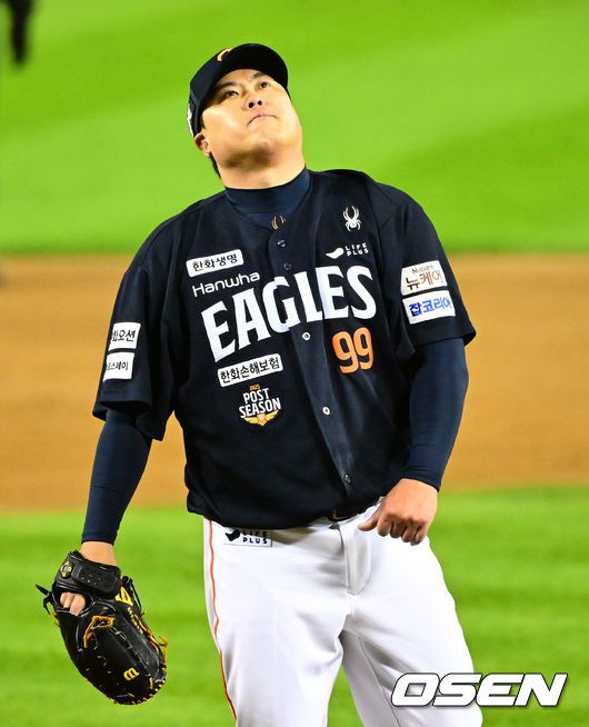 [OSEN=잠실, 지형준 기자] 27일 오후 서울 잠실야구장에서 2025 신한 SOL Bank KBO리그 포스트시즌 한국시리즈 2차전 LG 트윈스와 한화 이글스의 경기가 열렸다. LG는 임찬규, 한화는 류현진을 선발 투수로 내세웠다. 3회말 2사 2루에서 한화 류현진이 LG 박동원을 상대하며 생각에 잠겨 있다. 2025.10.27 /jpnews@osen.co.kr