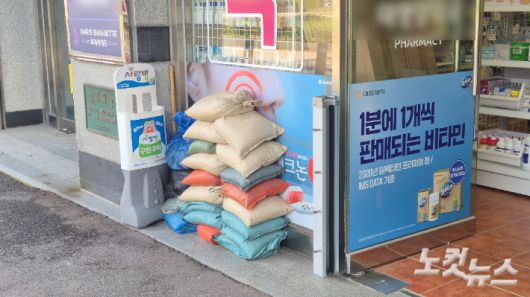 극한호우가 훑고 간 지 세 달이 지난 시점에도 광주 북구의 한 약국 앞에는 물을 막기 위한 모래주머니가 쌓여있다. 한아름 기자 |