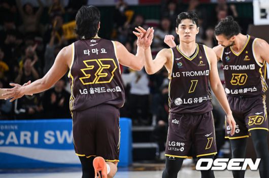 [OSEN=창원, 이석우 기자] 27일 창원 체육관에서 2025-2026 LG전자 프로농구 창원 LG와 부산 KCC의 경기가 열렸다. 공동 2위에 올라 있는 두 팀이, 이번 맞대결에서 공동 1위 도약이냐 공동 3위 추락이냐를 가르는 운명의 한 판 승부를 벌인다. 창원 LG 유기상이 역전골을 성공시킨 타마요와 하이파이브를 하고 있다. 2025.10.27 / foto0307@osen.co.kr