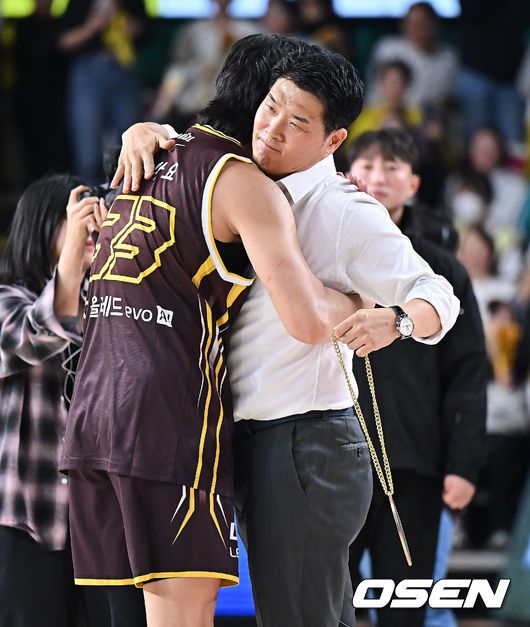 창원 LG 조상현 감독이 81-72로 극적인 역전승을 올리고 칼 타마요와 기쁨을 나누고 있다. 2025.10.27 / foto0307@osen.co.kr