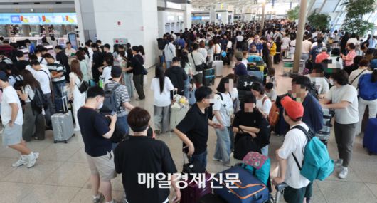 휴가철에 인천국제공항 1터미널 출국장 항공사 카운터가 여행객들로 붐비고 있다. [이승환 기자] |