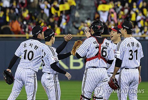 (서울=연합뉴스) 임화영 기자 = 27일 서울 잠실야구장에서 열린 2025 프로야구 한국시리즈 한화 이글스 대 LG 트윈스 2차전에서 13-5로 승리한 LG 선수들이 기뻐하고 있다. 2025.10.27