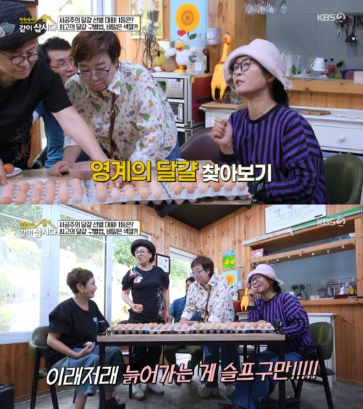 이후 박원숙, 혜은이, 홍진희, 황석정은 달걀 감별에 나섰다. 이때 황석정은 “눈을 가리고 달걀을 맛봐서 어떤 게 노계의 달걀이고 어떤 게 영계의 달걀인지 맞혀보는 게 어떠냐”고 제안했다. 이에 박원숙은 “이래저래 늙어가는 것도 슬퍼죽겠는데”라고 발끈해 웃음을 자아냈다.