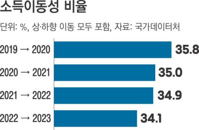 2023년 기준 소득이동성은 34.1%로 1년 전보다 0.8%포인트 하락했다. 소득이동성은 소득구간이 올라갔거나 내려간 비율을 합친 수치로, 2020년(35.8%) 이후 3년 연속 감소세다.