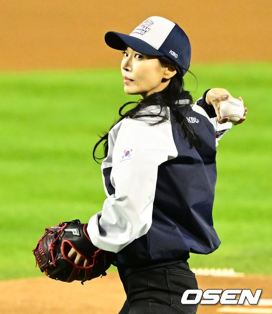 경기에 앞서 배우 김소연이 시구를 하고 있다. 2025.10.27 /jpnews@osen.co.kr