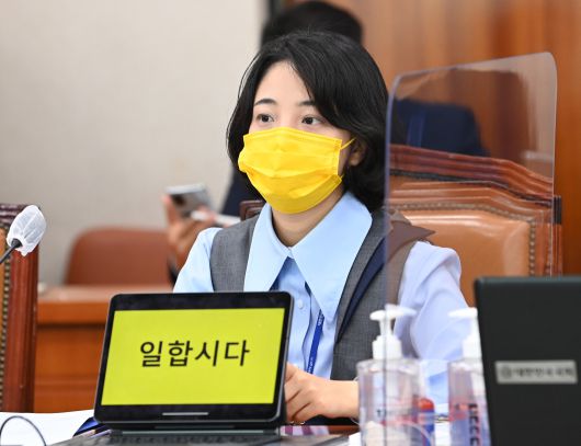2021년 산업통상자원부 국정감사에서 여야 정쟁이 심화할 당시 류호정 정의당 의원이 '일합시다'를 적어 즉석 피켓 시위를 하고 있다. /사진공동취재단 |