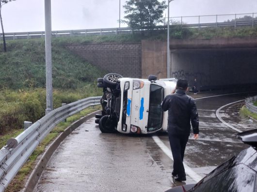 A씨에 따르면, 지난 13일 오후 6시쯤 폭우 속에서 고속도로를 달리던 어머니의 차량이 북양양IC 인근 커브길에서 전도되는 사고가 발생했다.