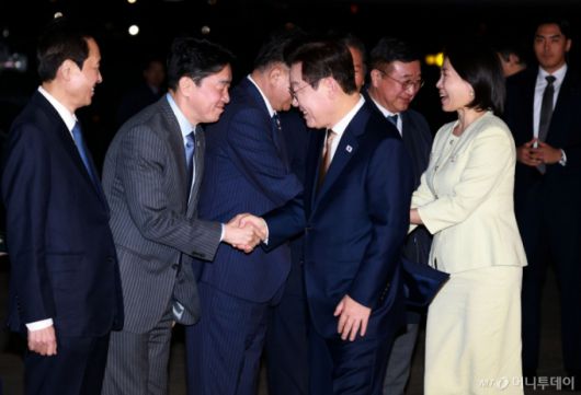 이 대통령과 부인 김혜경 여사는 27일 밤 공군 1호기 편으로 경기 성남 서울공항에 도착했다. 이 대통령과 김 여사는 하기한 후 환영 인사들을 향해 허리 굽혀 인사했다. 이 대통령은 윤호중 행정안전부 장관, 더불어민주당의 정청래 대표·김병기 원내대표, 대통령실의 강훈식 비서실장·우상호 정무수석 등 환영 인사들과 차례로 악수했다.