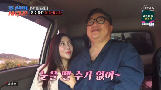1톤 트럭을 타고 이동하는 길, 원진서는 윤정수를 꿀 떨어지는 눈으로 바라보며 "눈을 뗄 수가 없어. 예쁨 멋짐"이라며 애정표현을 했다. 기사도 옆에 있는 상황에 민망해진 윤정수는 "너 이거 방송에 다 나간다"라고 단속하면서도 "아직 신혼이라서"라고 양해를 구하는 스윗함을 보였다.