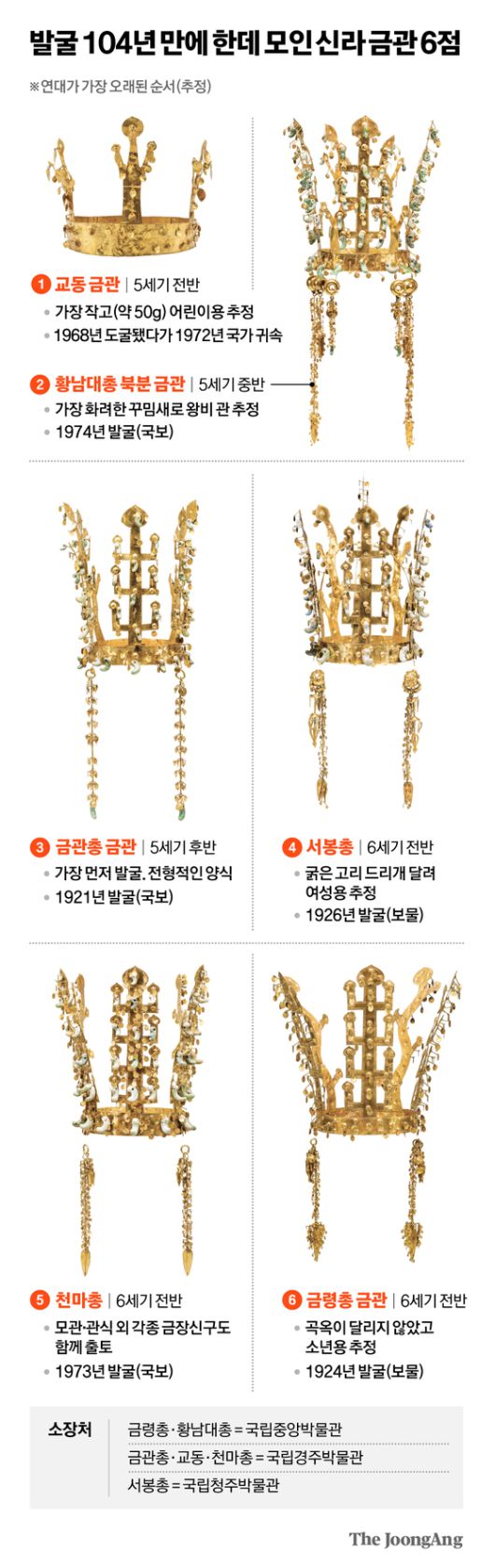 국립중앙박물관 2점(금관총·금령총), 국립경주박물관 3점(교동·황남대총·천마총), 국립청주박물관 1점(서봉총)신라 금관은 각 박물관의 대표 유물로서 관람 해설과 동선이 이에 맞춰져 있다. 6점을 한데 모으려는 시도가 여의치 않았던 이유다. 김 학예사는 “APEC 경주 개최가 확정되면서 3~4년 전부터 일정을 조율해 왔다”며 “한국 유물의 아이돌 같은 존재라 한자리에 모이는 게 언제 다시 가능할지 모른다”고 했다.