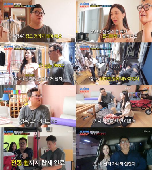 원진서는 옷방을 둘러보며 한 번도 안 신은 신발, 한 번도 안 맨 가방, 몇 년째 방치 중인 소파 등을 팔아야 한다고 주장했다. 윤정수가 아쉬워하자 원진서는 “안 쓰니까 빨리 팔아야 한다. 그래야 신혼 짐 놓을 공간이 나온다”고 설득했다.