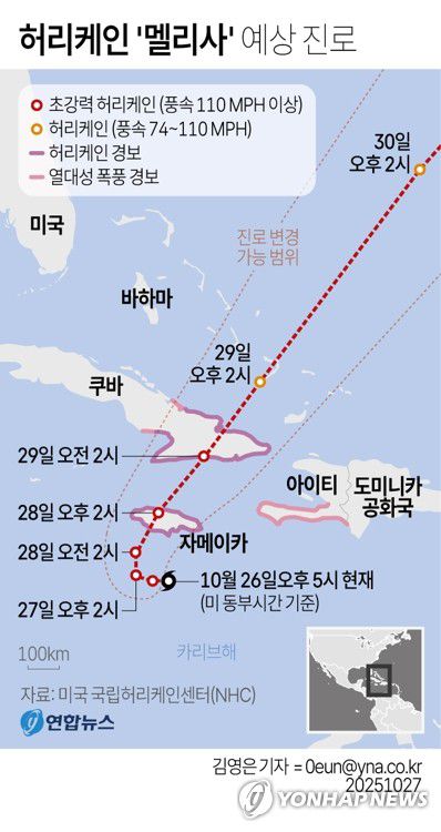 (멕시코시티=연합뉴스) 이재림 특파원 = 카리브해 지역 섬나라를 훑을 것으로 예상되는 초강력 허리케인 '멀리사'(Melissa·스페인어권에서는 멜리사라고 호칭) 접근으로 일대에 초비상이 걸렸다.