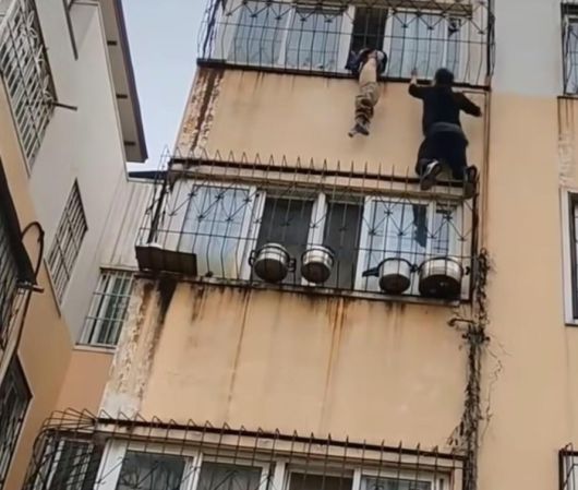 방범창에 매달려 있는 아이와 벽을 타고 올라간 배달기사 [지무뉴스 캡처] |