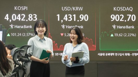 서울 중구 하나은행 본점 딜링룸 현황판에 코스피, 원·달러 환율, 코스닥 지수가 표시돼 있다. 연합뉴스 |