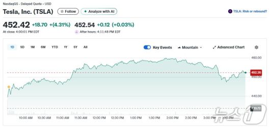 27일(현지 시각) 뉴욕증시에서 테슬라는 4.31% 급등한 452.42달러를 기록했다. 이로써 시총도 1조5050억달러로 늘었다.