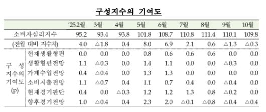 10월 소비자심리지수(CCSI)는 109.8로 전월보다 0.3p 하락했다. 향후 경기전망도 94로 전월보다 3p 낮아졌다. 한·미 무역 협상 장기화, 미·중 무역 갈등 재부각 등 대외 불확실성의 영향이다.