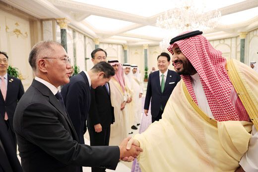 지난 2023년 10월 22일(현지시간) 정의선 현대차그룹 회장(왼쪽)이 사우디아라비아 리야드 야마마궁에서 윤석열 당시 대통령과 확대 회담을 마치고 오찬장으로 향하는 무함마드 빈 살만 빈 압둘아지즈 알 사우드 왕세자 겸 총리와 인사하고 있다. (사진=공동취재단) |