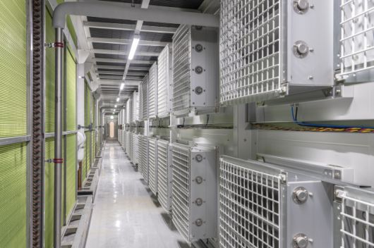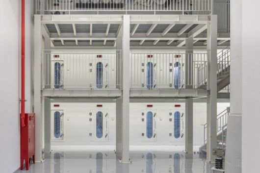 서버동 층고는 약 8미터. 이 중 서버가 배치된 공간은 4.8미터, 상부에는 전력선과 냉각 덕트가 지나가는 3.5미터 높이 기술층이 자리한다. 바닥 아래에서 올라온 공기가 천장 속으로 빠져나가며 열을 배출하는 구조다. 수직·수평으로 늘어선 랙과 정렬된 전선들이 만들어내는 질서감이 오히려 차분했다.