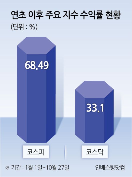 28일 인베스팅닷컴에 따르면 올해(1월1일~10월27일) 코스피와 코스닥의 누적 수익률은 각각 68.49%, 33.10%로 두 배 넘는 격차를 보였다. 한국거래소에 의하면 전날 기준 코스피와 코스닥의 주가수익비율(PER)은 각각 18.67배, 143.40배로 집계됐다. 코스닥 시장이 단기 실적보다 성장 잠재력에 가치를 두고 있다는 점을 보여주는 대목이다.