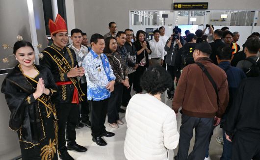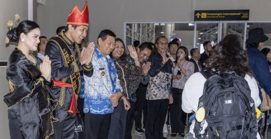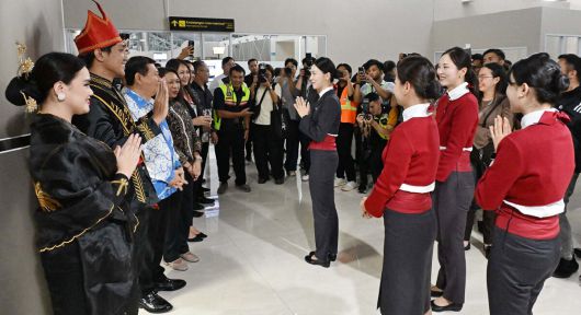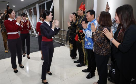 27일(현지시간) 인도네시아 북술라웨시주 마나도 삼 라툴랑이 국제공항에서 열린 이스타항공의 인천-마나도 노선 신규 취항식에서 니 마데 아유 마르티니 인도네시아 관광부 차관(왼쪽 세번째)을 비롯한 관계자들이 관광객들과 이스타항공 승무원들을 환영하고 있다.