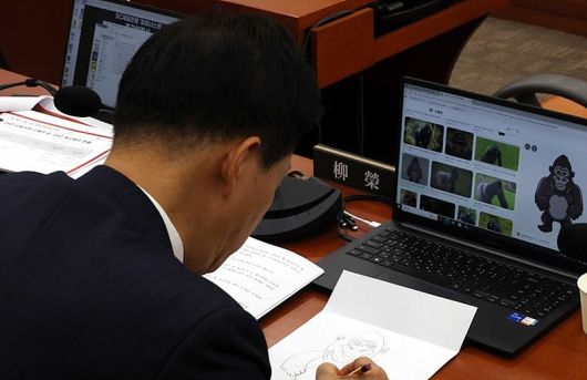 노트북으로 포털사이트에 ‘고릴라’를 검색한 뒤, 검색 결과로 나온 캐리커처 이미지를 그대로 따라 그린 것으로 파악된다. 중요한 국감장에서 이어진 그의 이중적인 모습에 많은 이들이 고개를 갸웃거리고 있다.