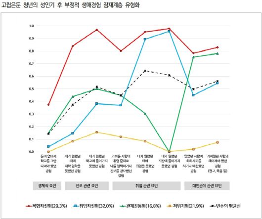 저위기형은 전반적으로 모든 지표에서 평균선 이하의 낮은 수준의 부정적 생애경험을 보였지만, 집단 내부적으로는 진로와 취업 영역에서 상대적으로 두드러진 부정적 경험을 보였다.