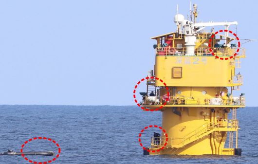 서해 잠정조치수역(PMZ)에 무단 설치된 중국 구조물 사진. 중국이 ‘선란(深藍) 2호’라 이름 붙인 철제 구조물에 사람들이 보인다. 좌측하단에는 이동을 위해 보트도 떠 있다. /이병진 의원실 |