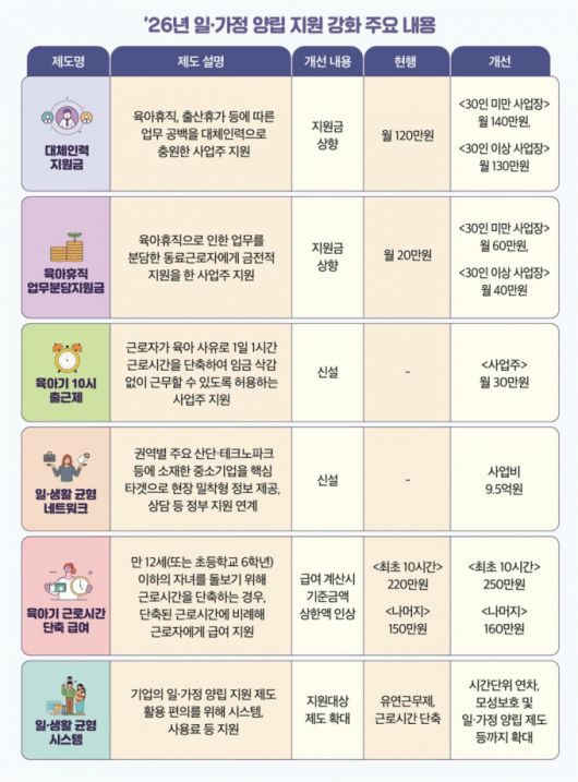 특히 중소기업과 30인 미만 소기업에 대한 지원을 확대할 예정이다. 출산휴가, 육아휴직 등에 따른 인력 공백을 메우기 위해 대체인력을 채용하는 경우 현재 월 최대 120만원을 지원한다. 내년부터 30인 미만 사업장에는 월 140만원, 30인 이상 사업장에는 월 130만원으로 인상한다. 지원금의 50%를 사후 지급하는 방식을 폐지하고 대체인력 사용기간에 전액 지급한다.