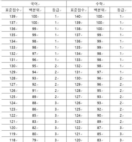예를 들어 2025학년도 수능에서 국어 표준점수 최고점인 139점과 그다음 표준점수인 137점의 백분위는 모두 100이었다. 만약 국어 표준점수 139점을 받은 A학생과 137점을 받은 B학생이 동일한 모집 단위에 지원했는데 그 모집 단위의 활용 지표가 표준점수라면 A학생이 앞서지만, 백분위를 활용한다면 두 학생은 동점이 되는 원리다. 수학 표준점수 123점을 받은 C학생과 표준점수 122점을 받은 D학생이 역시 동일한 모집 단위에 지원한다고 할 때 표준점수를 활용하면 1점 차이지만, 백분위를 활용하는 경우는 그 차이가 2점으로 확대된다. 따라서 학생들은 자신에게 유리한 활용 지표를 중심으로 지원을 검토해야 한다.