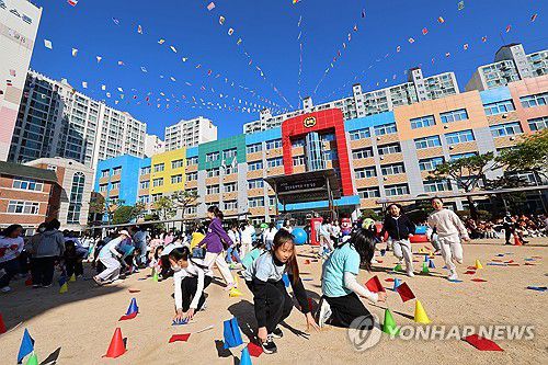 (인천=연합뉴스) 임순석 기자 = 28일 인천 부평구 부곡초등학교에서 열린 3~ 4학년 가을운동회에서 4학년 학생들이 깃발을 꽂는 고지전을 하고 있다. 2025.10.28