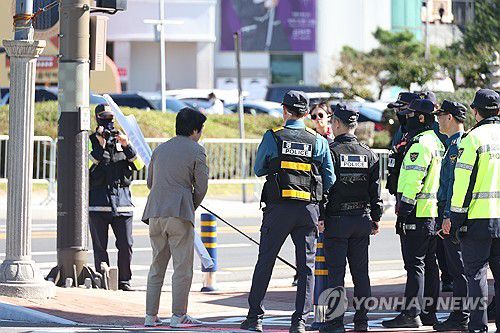 (경주=연합뉴스) 박세진 기자 = 28일 2025 경주 아시아태평양경제협력체(APEC) 정상회의장 앞에서 미국 정부의 무역 정책을 비판하는 내용과 트럼프 미국 대통령의 모습이 담긴 현수막을 펼치며 기습 1인 시위를 한 이제석 이제석광고연구소 대표가 경찰에 제지당하고 있다. 2025.10.28
