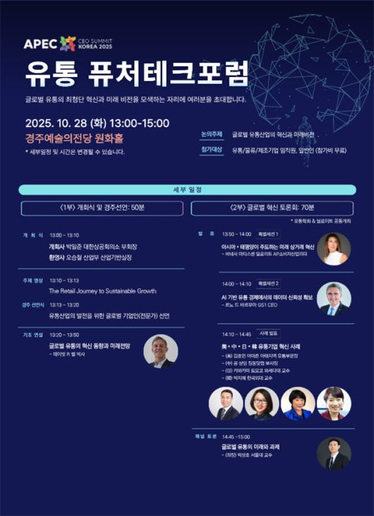 글로벌 유통업계가 아시아태평양경제협력체(APEC) 최고경영자(CEO) 서밋에서 유통산업 발전의 비전을 담아 글로벌 기업인 선언을 진행했다. 경주선언은 △인공지능(AI) 전환 △친환경 △표준협력을 3대 축으로 선정됐다.
