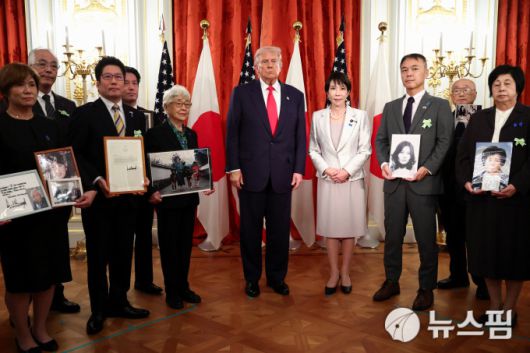 [서울=뉴스핌] 오영상 기자 = 도널드 트럼프 미국 대통령이 28일 도쿄의 영빈관에서 북한에 의해 납치된 일본인 피해자 가족들과 면담을 가졌다. 다카이치 사나에 일본 총리도 자리를 함께 했다.