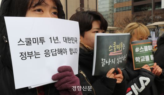 청소년 페미니즘 모임의 학생 등이 2019년 1월4일 서울 광화문광장에서 기자회견을 열고 ‘스쿨미투 UN에 가다’ 캠페인의 배경과 내용을 알리고 있다. 강윤중 기자 |