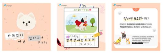 '반려견이 아닌 강아지가 있다?! 나는 청각장애인 보조견입니다'를 주제로 한 카드뉴스에는 장애인 보조견에 다양한 유형이 있음을 밝히고 청각장애인 보조견의 역할과 특성, 법령상 의무와 주의사항을 설명했다.