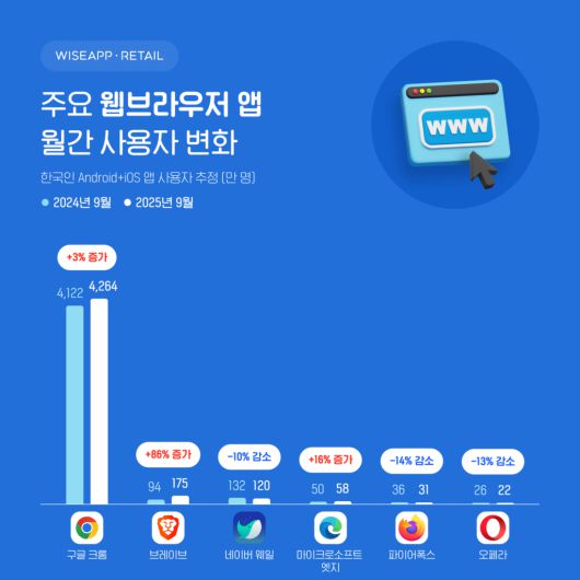지난 1년간 가장 많이 성장한 브라우저 앱은 '브레이브'로, 월간 사용자 수가 86% 증가했다. 그다음으로 마이크로소프트 엣지 16%, 구글 크롬 3% 순이었다.