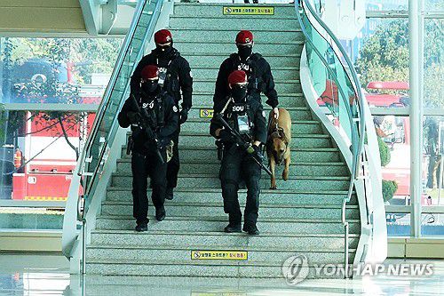 (포항=연합뉴스) 손대성 기자 = 경찰특공대가 아시아태평양경제협력체(APEC) 정상회의를 앞둔 28일 포항경주공항에서 수색견을 데리고 구석구석 수색하고 있다. 2025.10.28