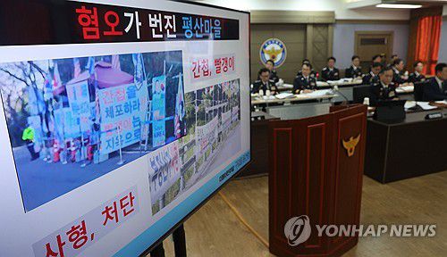 (창원=연합뉴스) 김동민 기자 = 28일 오후 경남경찰청에서 열린 국회 행정안전위원회 경남경찰청 국감에서 더불어민주당 윤건영 의원이 공개한 평산마을 집회 상황이 모니터에 나오고 있다. 경남 양산시 하북면에 위치한 평산마을은 문재인 전 대통령 내외가 거주하는 동네다. 2025.10.28