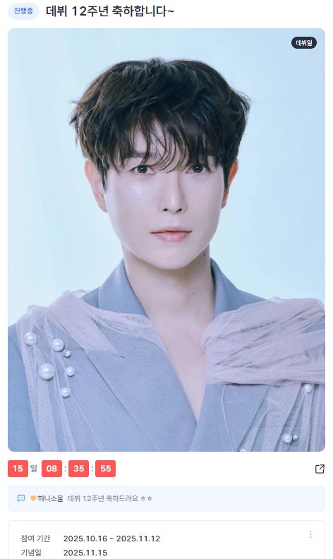 지난 16일부터 오는 11월 12일까지 참여할 수 있으며, 현재 2,200 하트가 모였다. 팬들은 "12주년 진심으로 축하드려요", "노래도 연기도 다 되는 멋진 사람" 등 다양한 댓글을 남기며 따뜻한 축하의 마음을 전하고 있다.