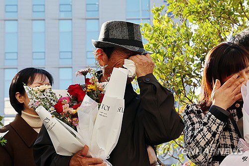 (광주=연합뉴스) 정다움 기자 = 28일 오후 광주 동구 광주고등법원 앞에서 청산가리 막걸리 사건의 피고인이 사건 발생 16년 만에 재심에서 무죄를 선고받은 뒤 연 기자회견에서 눈시울을 붉히고 있다.
